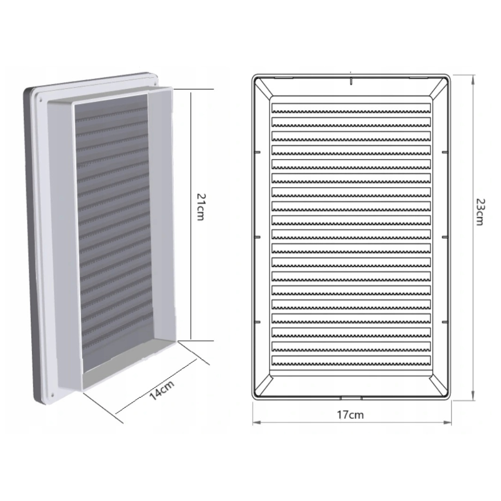 Plusem tej kratki wentylacyjnej jest wylana już na etapie produkcji siatka, która trzyma insekty z daleka od mieszkania. Nasz unikalny sposób polega umieszczeniu siatki w projekcie na etapie produkcji dzięki czemu nie brudzi się, nie zrywa, nie niszczy oraz jest w kolorze kratki – na stałe zachowuje swoje walory estetyczne. Kształt żaluzji kieruje powietrze “w dół” dzięki czemu w pomieszczeniach, w których znajduje się nasza kratka wentylacyjna nie powstaje efekt przeciągu